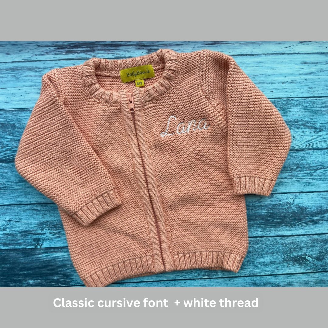 Popular thread colours for this cardigan are grey, gold and cerise pink - if you do not select a colour when ordering we will choose one of these colours for you.