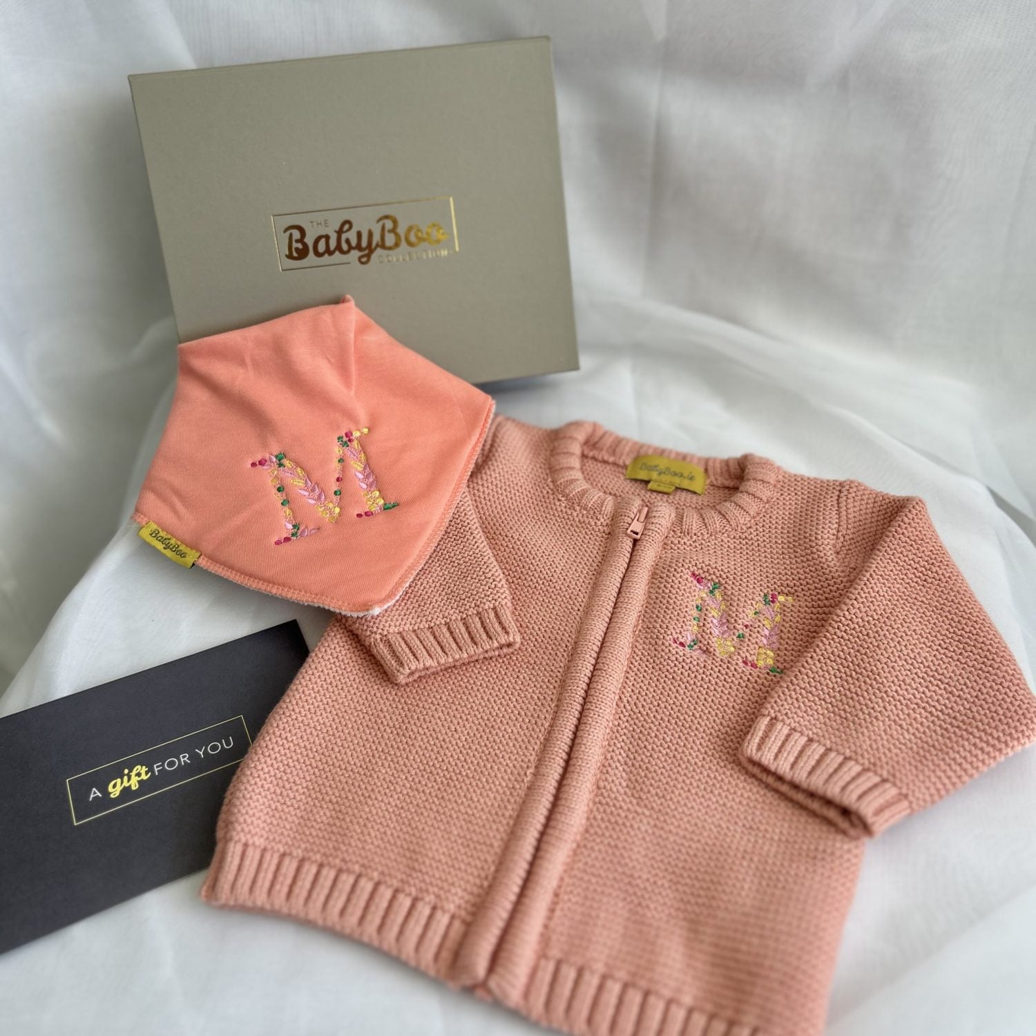 This gift box includes one of our Floral Letter Zipped Cardigans, made from the softest organic cotton to keep little ones warm and comfortable. Complete the set with our Floral Letter DribbleBoo Bandana Bib, designed with an ultra-absorbent organic cotton front and a soft fleece backing to keep baby dry while adding a personalised touch.
