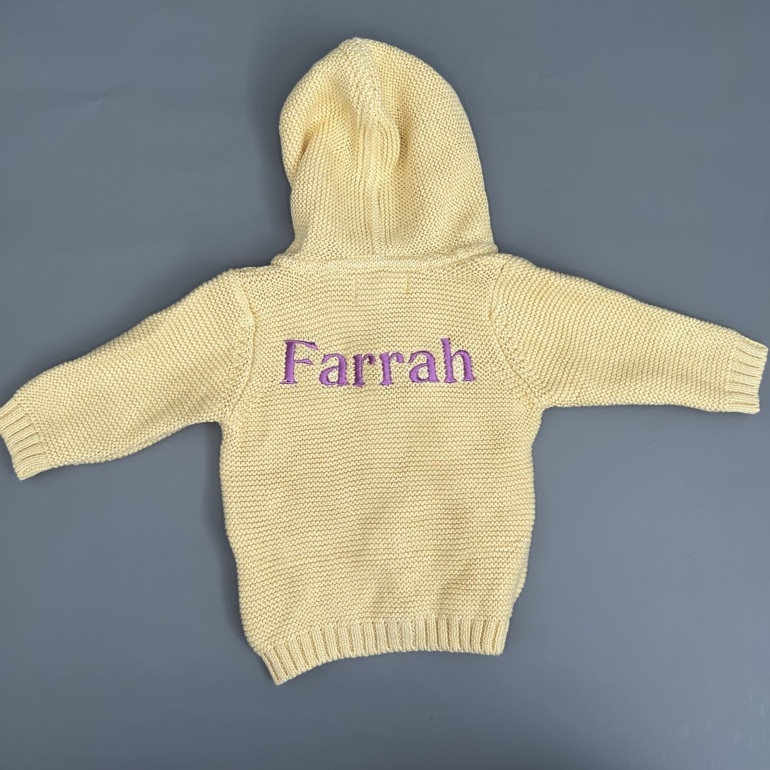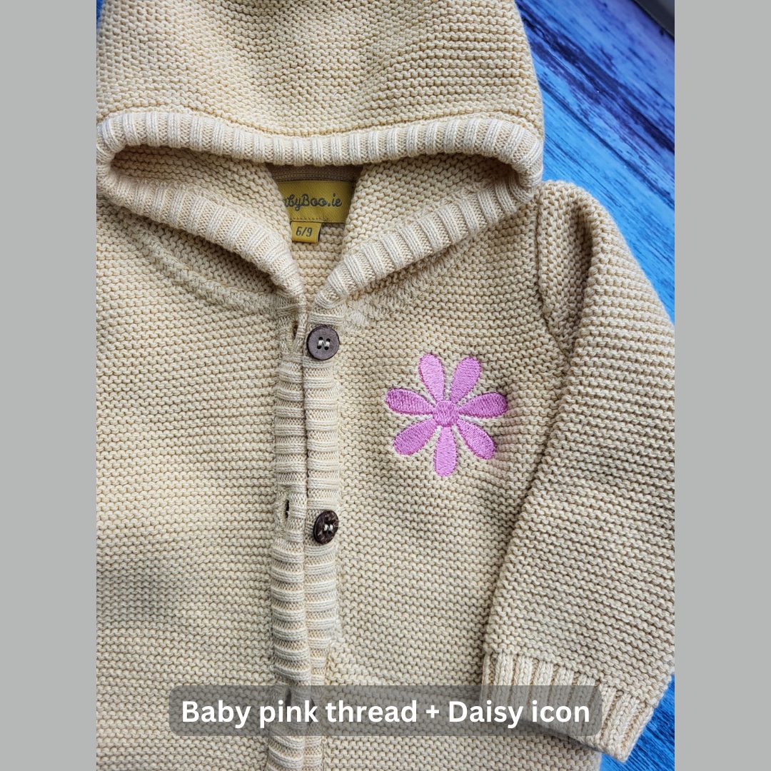 Popular thread colours for this cardigan are grey, navy and cerise pink – if you do not select a colour when ordering we will choose one of these colours for you.