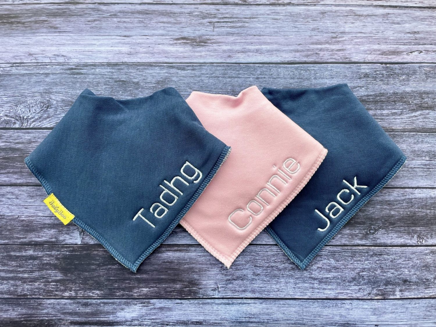 Please note there may be slight colour or size differences between bibs and photos of bibs. The font will always be the same on our Name to the side bib.