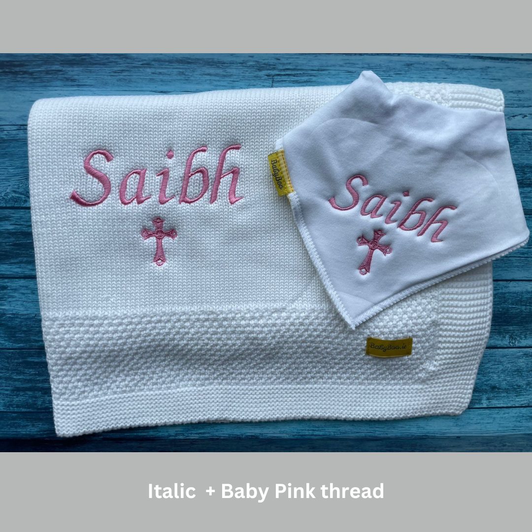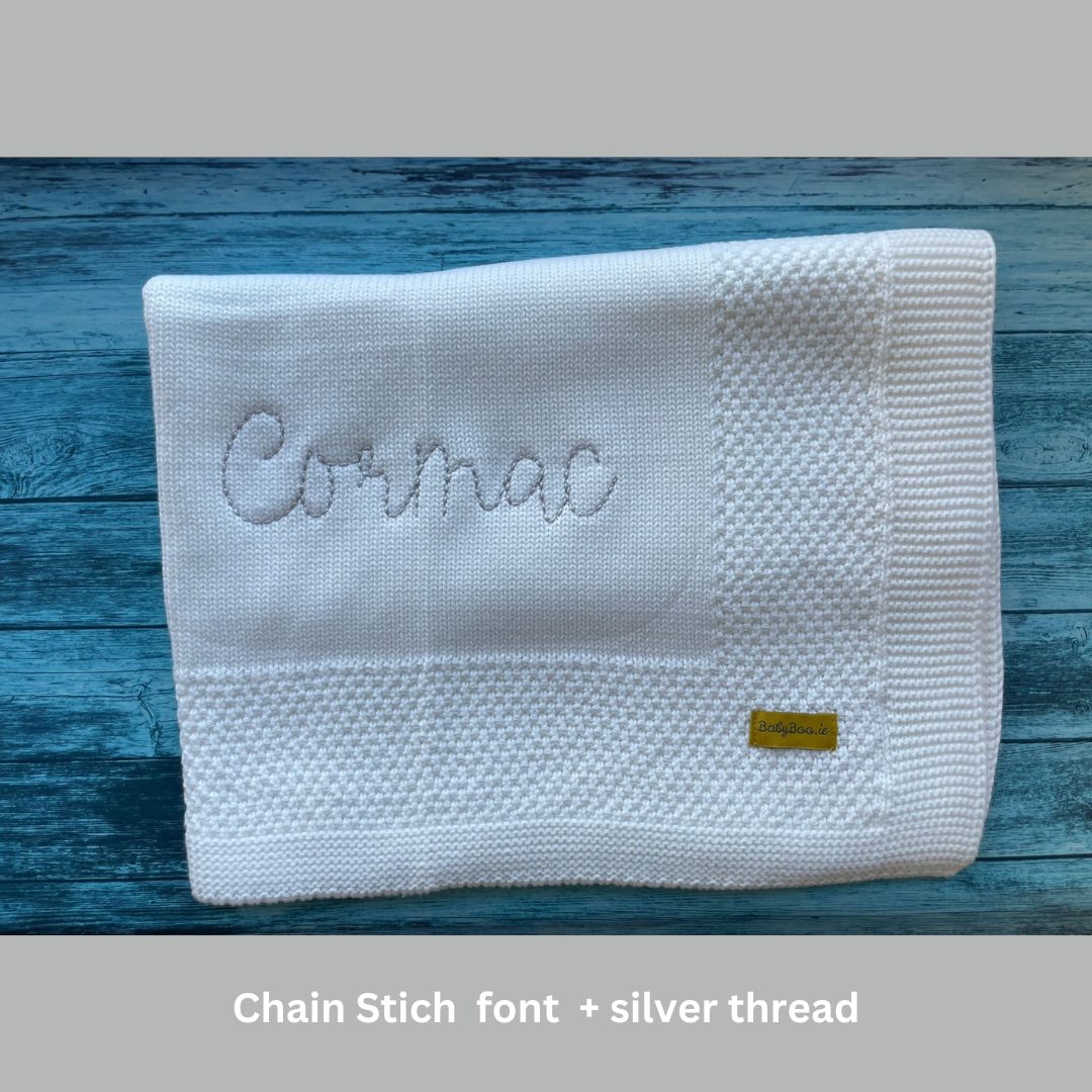 Silver, gold, baby blue and baby pink thread colours are the most popular choices for this blanket, if you do not choose a colour we will choose one of these for you.