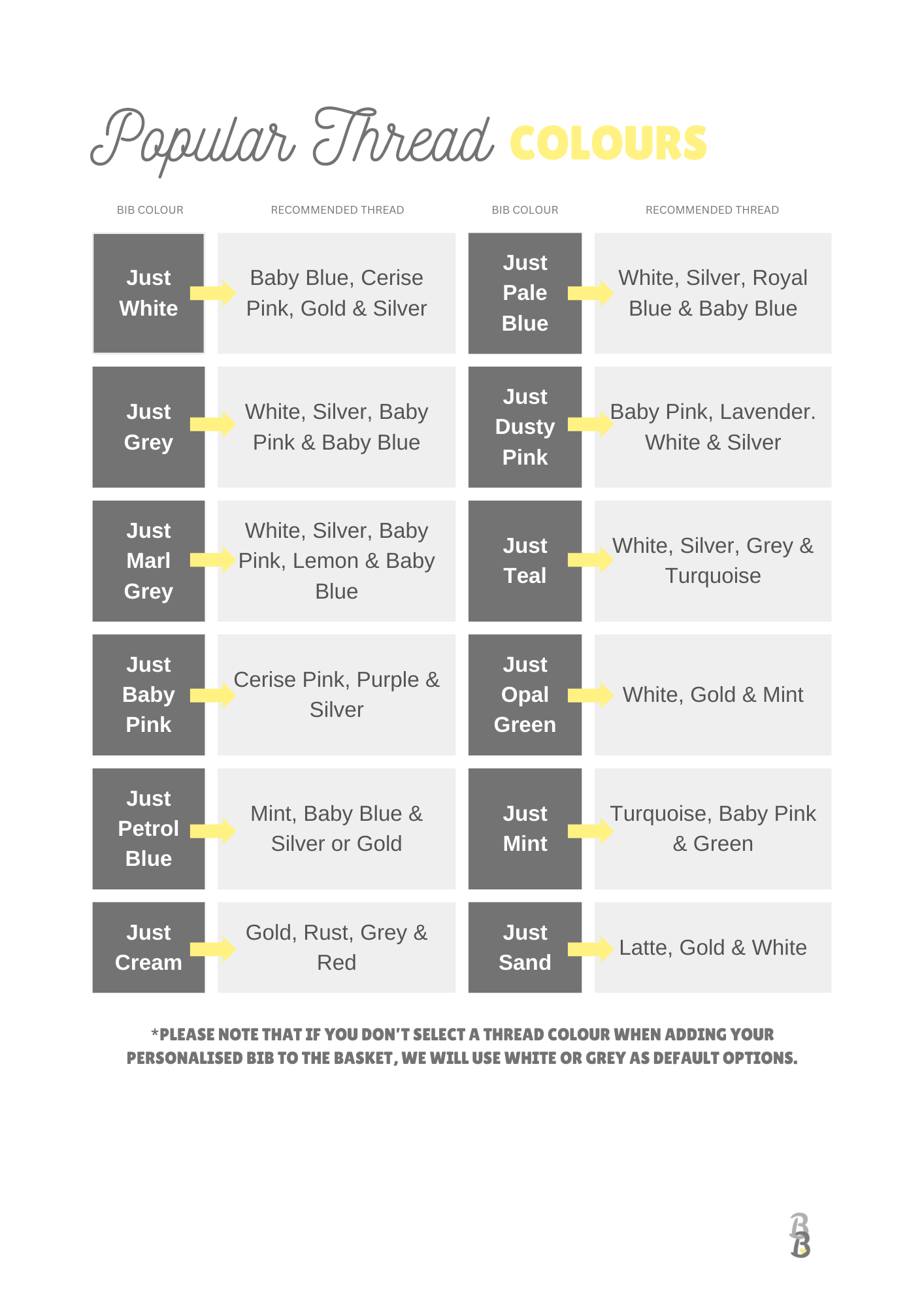 Please note that if you don’t select a thread colour when adding your personalised bib to the basket, we will use white or grey as default option.